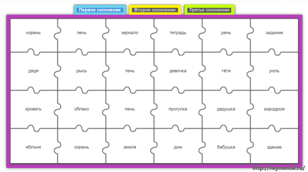 (И) Самостоятельная работа. На доске расписаны слова. 1-ряд записывает слова 1 склонения, 2-й ряд 2 склонения, 3-й ряд 3 склонения. Машина, дочь, собака, папа, окно, поле, печь, дедушка, кран, тетрадь ,отец, степь. (Г)Работа в группах. Раскрась пазл