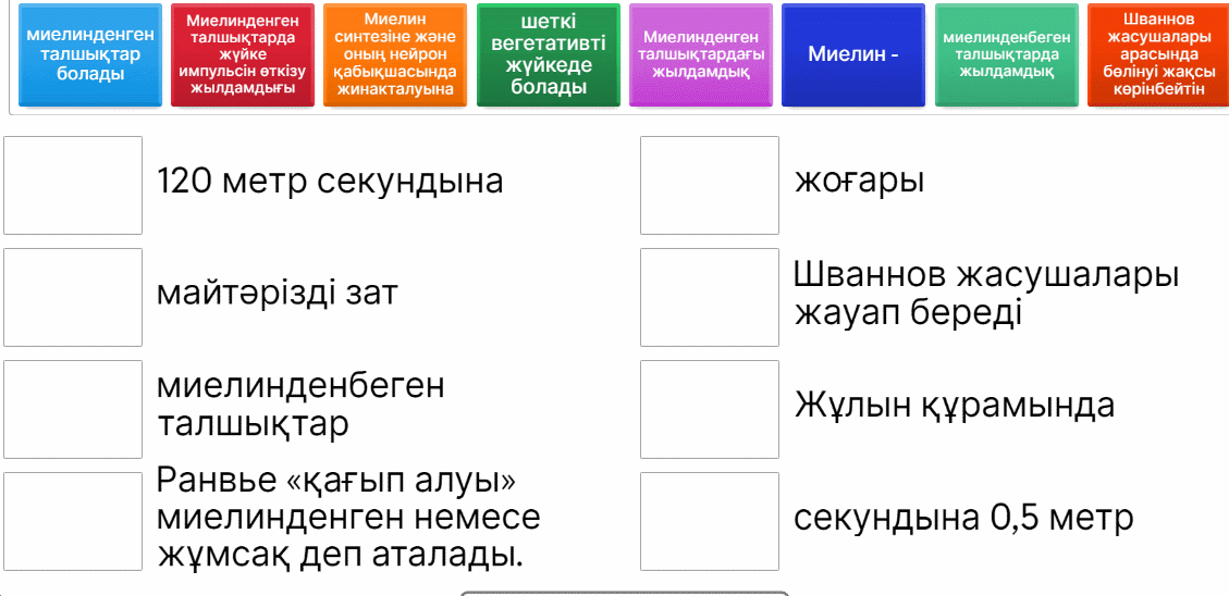 Мәтін: Мысықтың пырылдауы кезінде адамның миында электрлік белсенділік жоғарылап, "гормон бақыт" деп аталатын серотонин бөлінеді. Сонымен қатар, бұл терапия жүрек соғу жиілігін тұрақтандырып, қан қысымын төмендетеді. Мысықтың жанында болу адам денесінде биоэлектрлік үдерістердің реттелуіне көмектеседі. Тапсырмалар: 1. Сәйкестікті табыңыз