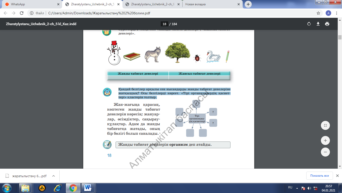 Қандай белгілер арқылы сен нысандарды жанды табиғат денелеріне жатқыздың? Осы белгілерді көрсетеді. «Тірі организмдердің қасиеттері» кластерін толтырады.