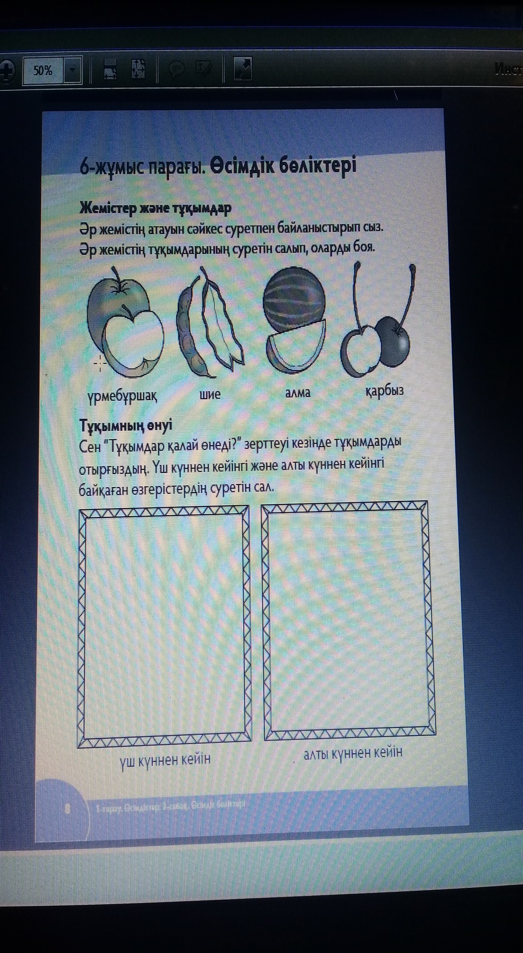 (Ж.ж) Дәптермен жұмыс кезінде саралау тәсілін пайдаландым 1 топ: Өсімдік бөліктерінің атауларын жазады 2 топ:Әр жемістің атауын сәйкес суретпен байланыстырып сыз. 3 топ:Әр жемістің тұқымдарының суретін салып, суретті боя.