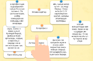 Оқушыларға Суретке қарай отырып тақырыпты анықтап жапырақтардың түсі неге әртүрлі екенін анықтап атайды Бейнероликті қарайды. Пигменттерді атайды.Хлорофиллді атайды Оқушылар пигменттің түрлері бойынша сәйкестендіреді Оқушылар хлорофилл пигментін бөлу әдістерін қарап тәжірибе жасайды Оқушылар жапырақтан хлорофиллді бөледі Оқушылар өсімдік жапырағының суретін салып жапырағын түстер ажыратады |