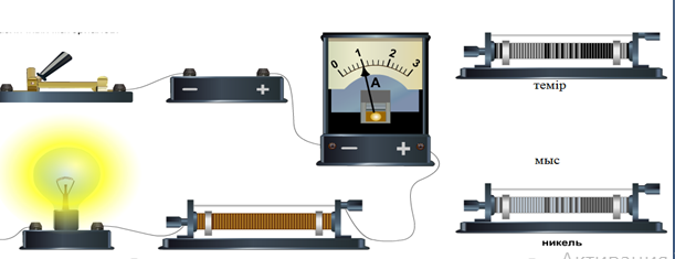 8.4.2.6 – тізбек бөлігі үшін Ом заңын есептер шығаруда қолдану; 8.4.2.7– кедергінің физикалық мағынасын, оның өлшем бірлігін түсіндіру; 8.4.2.9 - өткізгіштерді тізбектей жалғаудың заңдылықтарын эксперимент арқылы алу |