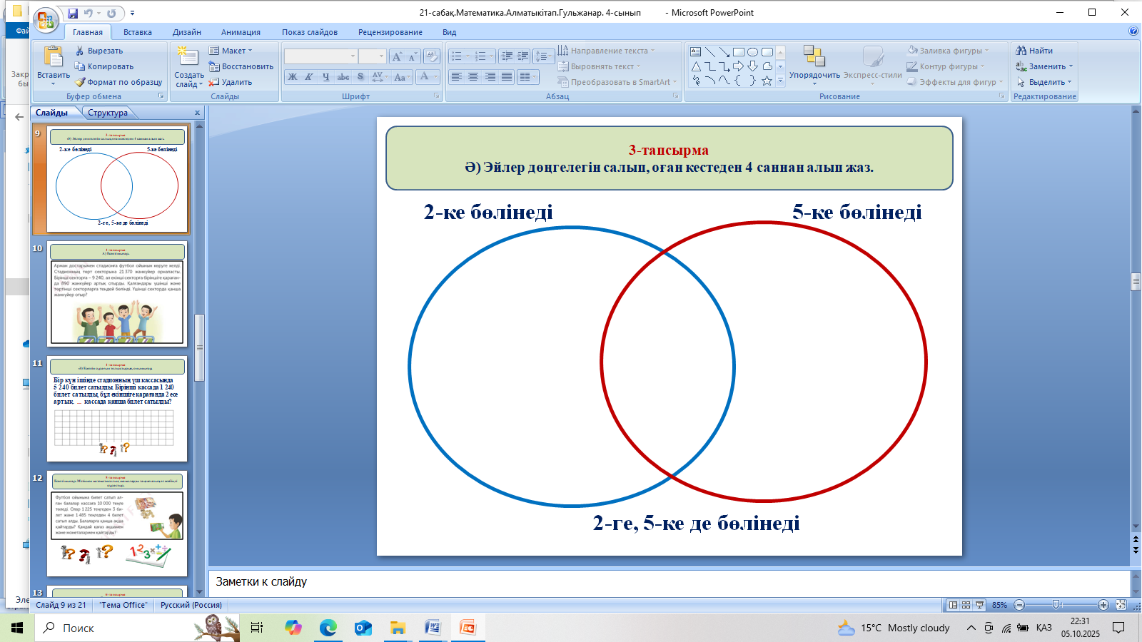 2-ге де, 5-ке де бөлінетін сандарды диаграммаға жазады |