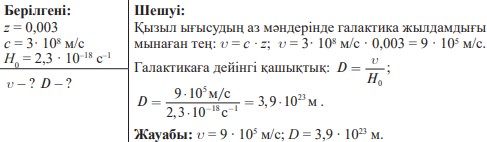 Астроном Жерден 6,8*1023 м қашықтықта орналасқан галактиканың алыстаужылдамдығын есептейді. Ол жылдамдық 1,5*106 м/с. Осы мәндерді пайдаланып Хаббл тҧрақтысын анықтаңыз.