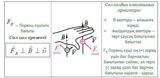 Лоренц күшін сол қол ережесін қолданып, анықтай алады