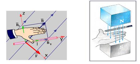 Ампер күші сол қол ережесі арқылы анықталады. Егер сол қолымыздың алақанын N полюсінен шығатын магнит өрісінің күш сызықтары тесіп өтетіндей орналастырсақ, төрт саусақ өткізгіштегі токтың бағытын көрсетеді, ал 90 0 бұрылған бас бармақ өткізгішке әсер ететін Ампер күшінің бағытын көрсетеді.