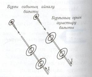 Егер бұрғыны токтың бағытымен қозғалта бұраса, онда бұрғы тұтқасының айналу бағыты өрістің магниттік күш сызықтарының бағытын көрсетеді Түзу токтың магнит өрісіннің темір ұнтағына әсерін түсіндіреді Бұрғы ережесін түсіндіру.