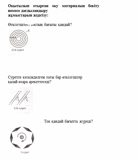 Жаңа материалды игеру.Топпен жұмыс. "Елші" әдісі.Топтар тапсырмаларды орындап болғаннан кейін топтың бір адамы «елші» болып сайланады да, зерделенген материалды түсіндіру және жинақтау, бұл туралы жаңа топтың ойын, бір шешімге келгенін немесе жетістікке жеткенін білу үшін басқа топқа барады. Бұдан кейін елші өз тобына қайтып оралып, білгендерін айтып береді. Сондай-ақ бұл әдіс елшінің тілді қолдану шеберлігін көрсетеді, әрі белсенді тыңдаушылар тобын қалыптастырады. Топтық жұмыс арқылы коммуникативті дағды, тәжірибелік дағдысы дамыйды 1-топ.Ток. Оқушыларға оқулықтан Эрстед тәжірибесін оқып меңгеруге тапсырма беру. Түзу токтың магнит өрісін экспериментте жүзінде анықтау. Электр тогы бар мыс өткізгіш орналасқан кеңістікте магнит тілгшені қозғалысқа келтіретін күштер болатынын тәжірибе нәтижесін түсіндіреді. Дескриптор Эксперимент жасайды. Схемасын сызады, нәтижесін түсіндіреді. 2-топ.Магнит. «Суретті әңгімеле.» әдісі бойынша түсіндіреді. Оқушыға сурет беріледі, қажет болса әңгіменің жаңа сөздерін алдын ала үйретуге болады. 1.Тогы бар өткізгішті магнит өрісіне қойғанда не байқаймыз? 2.Параллель өткізгіштен бір бағытта және қарама-қарсы бағытта ток өткенде не себепті өткізгіштер тартылады, тебіледі? Дескриптор Бірдей бағыттағы ток өтетін екі параллель өткізгіш бірін-бірі тартады, ал қарсы бағыттағы ток өтетін өткізгіштер бірін-бірі тебуін түсіндіреді. Электр тогы өтетін өткізгіштер арасындағы мұндай өзара әрекеттесу магниттік өзара әрекеттесуін атайды.
