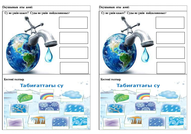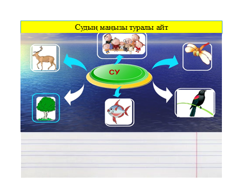Өткенді пысықтау Өтілген бөлімді пысықтау «Табан іздері» әдісі 1.Табиғат деген не? 2. Табиғат нешеге бөлінеді? 3. Тірі табиғатты ата? 4. Өлі табиғатты ата? 5. Тірі табиғатқа қажеттілік? 6. Судың қандай қасиеттері бар? 7. Судың табиғаттағы үш күйін ата? 8. Суда еритін заттар нелер? 10. Суда ерімейтін заттар нелер? Бірақ араласады. 11. Су көздері нелер? 12.Судың адам үшін маңызы. Өткенді пысықтау ҚБ тапсырмаларын орында Жұптық жұмыс