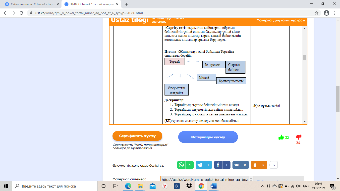 Оқушылар Тортайдың сыртқы бейнесін,мінезін ашады.Тортайдың әлеуметтік жағдайын сипаттайды, іс -әрекетін қызығушылығын анықтайды.
