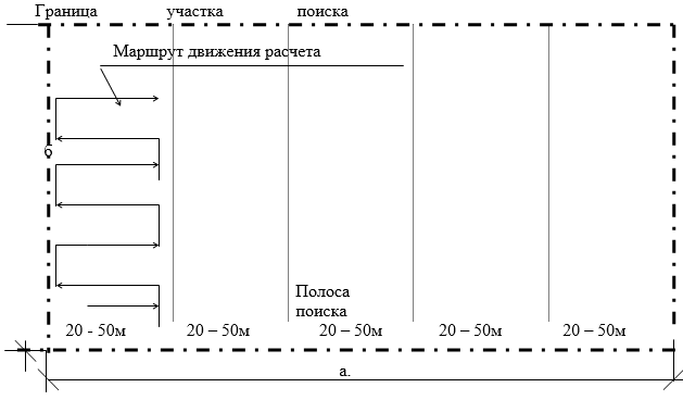 Объектінің немесе жұмыс ауданының аумағын тексеру үшін 2-3 адамнан тұратын есеп жіберіледі. Іздеу бөлімі әр есептеуге тағайындалған жолақтарға бөлінеді. Іздеу жолағының ені бірқатар факторларға байланысты (үйіндінің сипаты, қозғалыс жағдайлары, көріну және т.б.) және 20-50 м болуы мүмкін. жұмыстарды орындаудың ең ұтымды әдісі-барлаушылардың жұптасқан зигзаг қозғалысы.