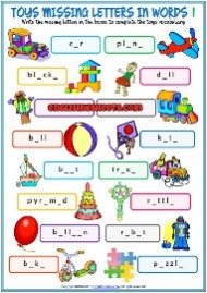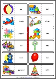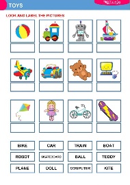 Writing Work in groups. I give the students worksheets and they filling; insert the missing letter, matching picture with words, put in correct order . "Can you find the toy that matches this name?" "What other toys do you see in the picture?" |