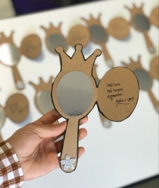 Students take a mirror from teacher and reads the sentences in it after that prepares to the lesson |