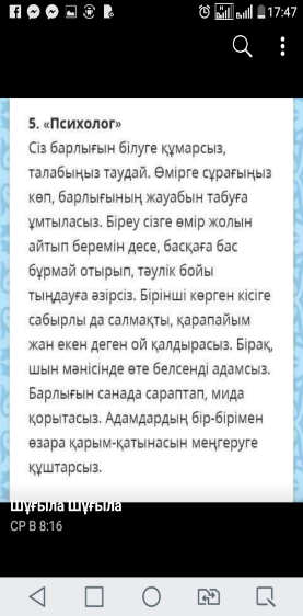 Әдістері: пікір алмасу, сұрақ-жауап, психологиялық тест.