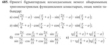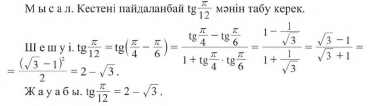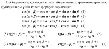 9.2.4.3 бұрыштардың қосындысы мен айырымының, жарты және қос бұрыштың тригонометриялық формулаларын қорытып шығару және қолдану; |