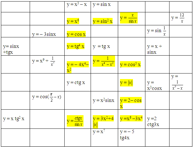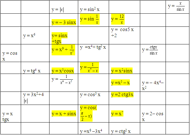 Тапсырма: Кесте топтарға беріліп тақ (жұп ) функцияны анықтайды. «Математикалық лото» Нұсқа 1. Тапсырма: Жұп функция жазылған ұяшықты бояу керек.