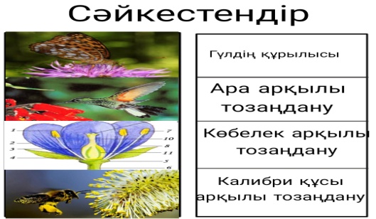 Бейнеролик арқылы сабақ тақырыбымен танысады Сабақ мақсатымен таныс болады. Әр топ тапсырма орындап,ортаға шығып қорғайды Тозаңданудың өсімдік үшін маңызын түсінеді. Конверттегі сұрақтар арқылы тозаңдану туралы біледі