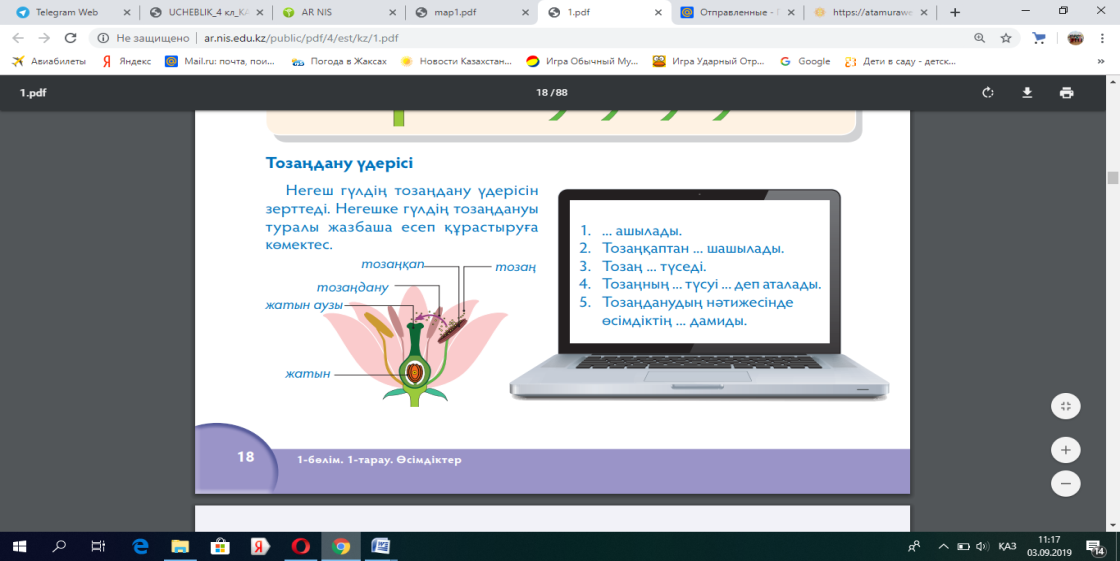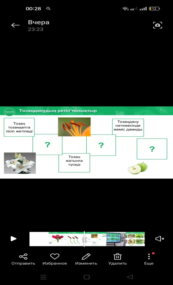1.Тапсырма «Ретін анықта» әдісі Топтық жұмыс (оқушылар көрген бейнеролик арқылы берілген тапсырмадағы тозаңданудың ретін анықтап,толықтырып,тозаңдану нәтижесінде тұқымның түзілуін сипаттайды) |