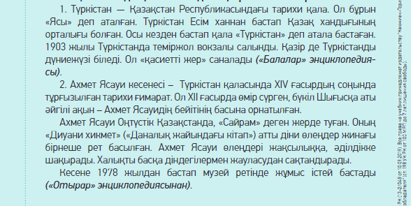 3-тапсырма. Сөз әдебі мен сөйлеу этикетін сақтап, диалог құрастырыңдар; Диалог құруға берілген тақырыптар: 1)Түркістан қаласы 2)Қожа Ахмет Ясауи кесенесі 3)Арыстан бап кесенесі