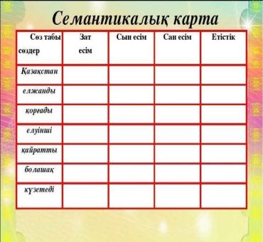 4.1.5.1 тыңдаған оқиға/әңгіме бөліктерінің жалғасын болжау 4.2.1.1 берілген сөздердің зат есім, сан есім, сын есімдерді ажырату; |