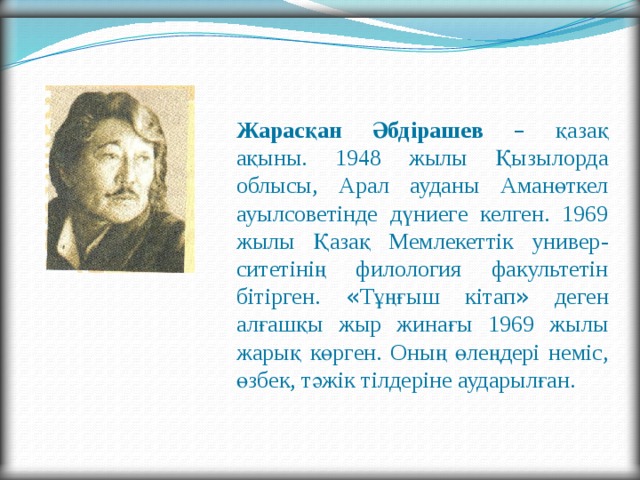 1-тапсырм Ұжымдық жұмыс «Спиральді оқу» әдісі Автордың өмірі мен шығармашылығы туралы мәлімет ұсыну. Өлеңді оқы. Өлең не туралы? ЕББҚ Өлең не туралы? Талқылау сұрақтары: Атасы немересіне қандай жақсы тілектер айтты? |