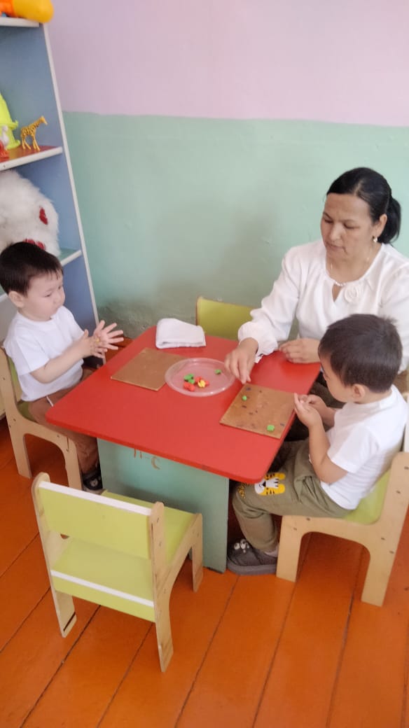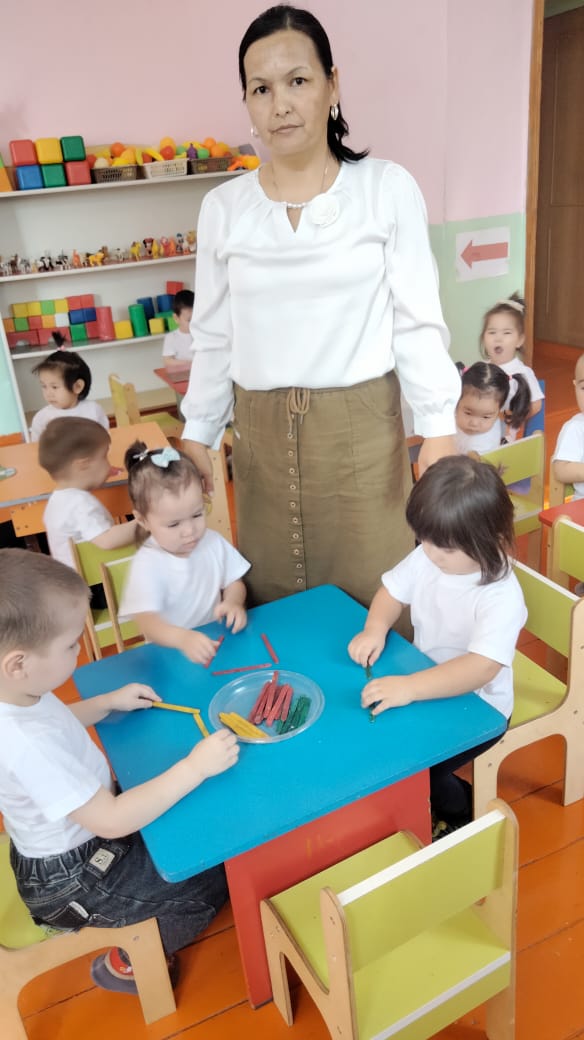Мақсаты : Ұсақ қол маторикасын дамыта отырып , ойын арқылы тапсырмаларды орындайды . Ойын барысында сәйкестендіру , түстерді ажырату , дағдыларын танытады . Бірлесе жұмыс жасай алады.