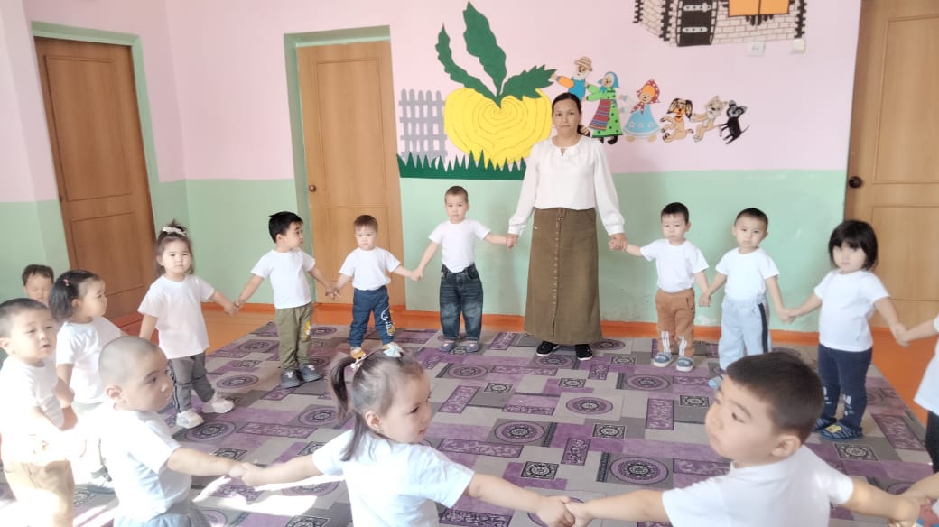 Балалар: жақсы Жақсы көңіл күймен бір-біріміздің қолымыздан ұстап ,шаттық шеңберін айтып келген қонақ апайлармен амандасып алайық! Біздер тату боламыз