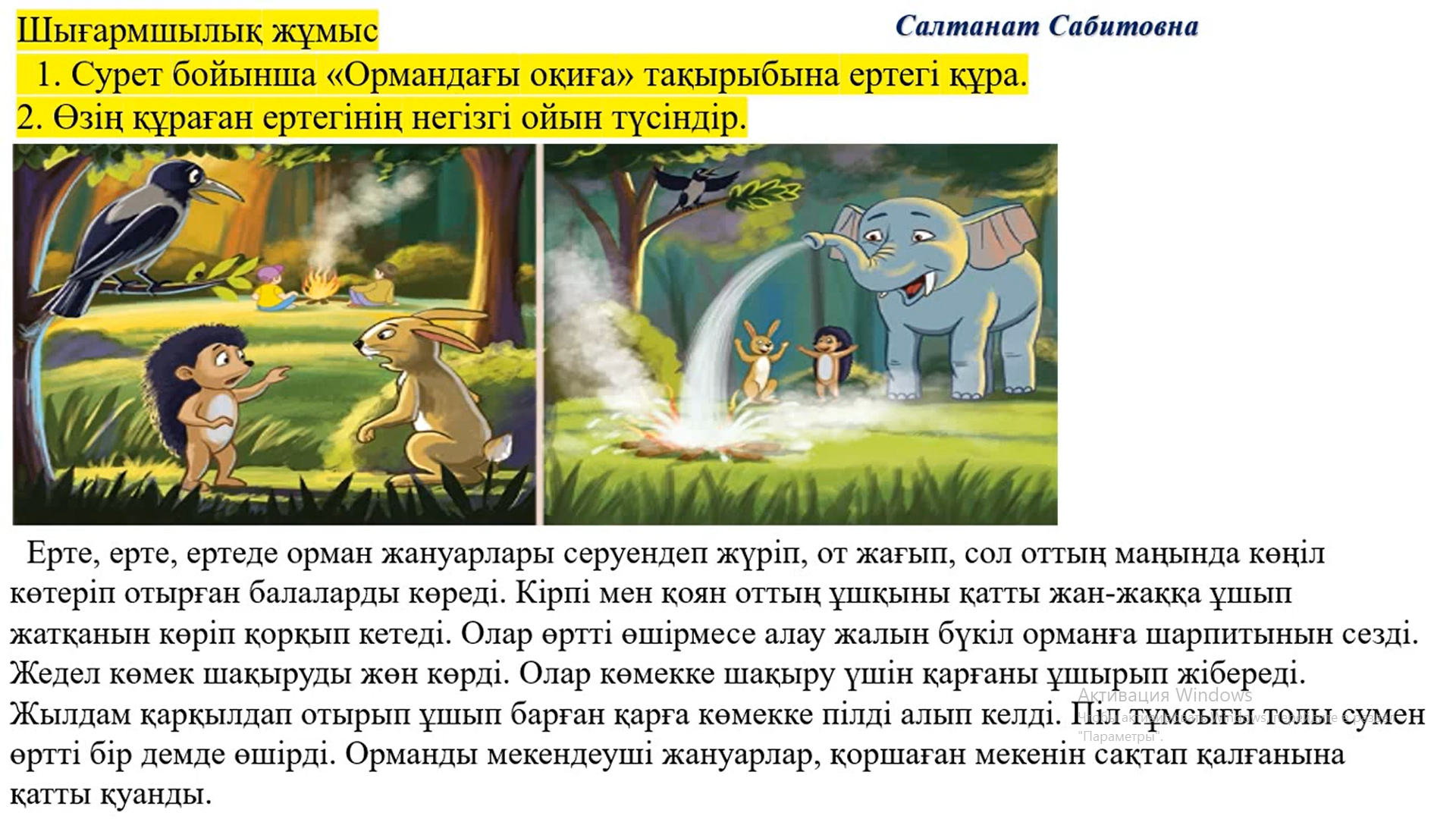 4.2.3.1 шығарманың тақырыбы және негізгі ойды анықтау, автордың ойын мәтін деректерінен келтіре отырып дәлелдеу; 4.3.2.1 таныс мәтінге жаңа кейіпкерлер қосу, жаңа сюжеттер енгізу, өлең (төрт жолды) жазу |