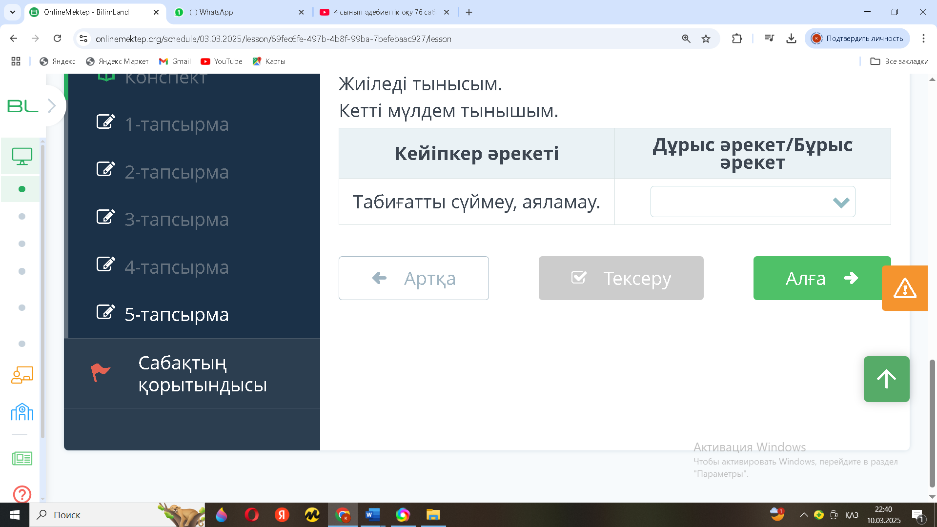 1.Табиғатты сүймейтін бала қандай болып өседі? Мейірімді Тасжүрек Қамқор 2.Жұрттың кеселін не емдейді? табиғат арман қиял 3.Табиғатқа не жатады? дүкен, мұражай, спорт алаңы үй, ғимарат, мектеп, сынып Ауа, су, Жер, Күн, аспан. 4. Үзіндідегі кейіпкердің әрекетін бағала.