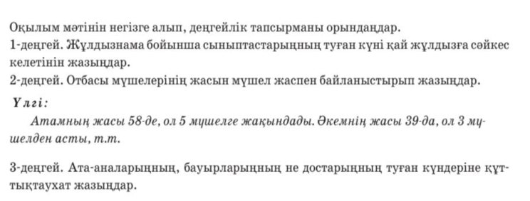 1-тапсырма. Мәтіндегі ақпаратты негізге ала отырып, досыңа "Мүшел жас" туралы хат жаз. Хатта мүшел жастың мағынасы, оның ерекшелігі, халық сенімі мен сақтану жолдары туралы айтып бер. Өз пікіріңді де қос. Үлгі: Сәлем, Айдана! Саған қызықты бір нәрсе айтқым келіп отыр. Біз бүгін "Мүшел жас" туралы мәтін оқыдық. Қазақ халқы адамның өмір жасын 12 жылдан бір мүшел деп есептейді екен. Алғашқы мүшел 13 жаста басталып, кейін әр 12 жыл сайын қайталанады. Мысалы, 25, 37, 49 — бұлар да мүшел жас. Мәтінде халық мүшел жасты неге қауіпті санайтыны да айтылған. Бұл кезде адам бойында үлкен өзгерістер болады екен. Сондықтан бұрынғы ата-бабаларымыз мүшел жасқа келгенде арнайы киім тіктіріп, құрбан шалып, садақа беріп отырған. Бұл адамның амандығы үшін жасалған. Меніңше, бұл — халықтың өмірлік тәжірибесіне сүйеніп, сақтану мақсатында қалыптасқан жақсы дәстүр. Саған да қызық болды деп ойлаймын. Осы жайлы пікірің қандай? **Құрметпен: Аружан** 3-тапсырма. Деңгейлік тапсырма.