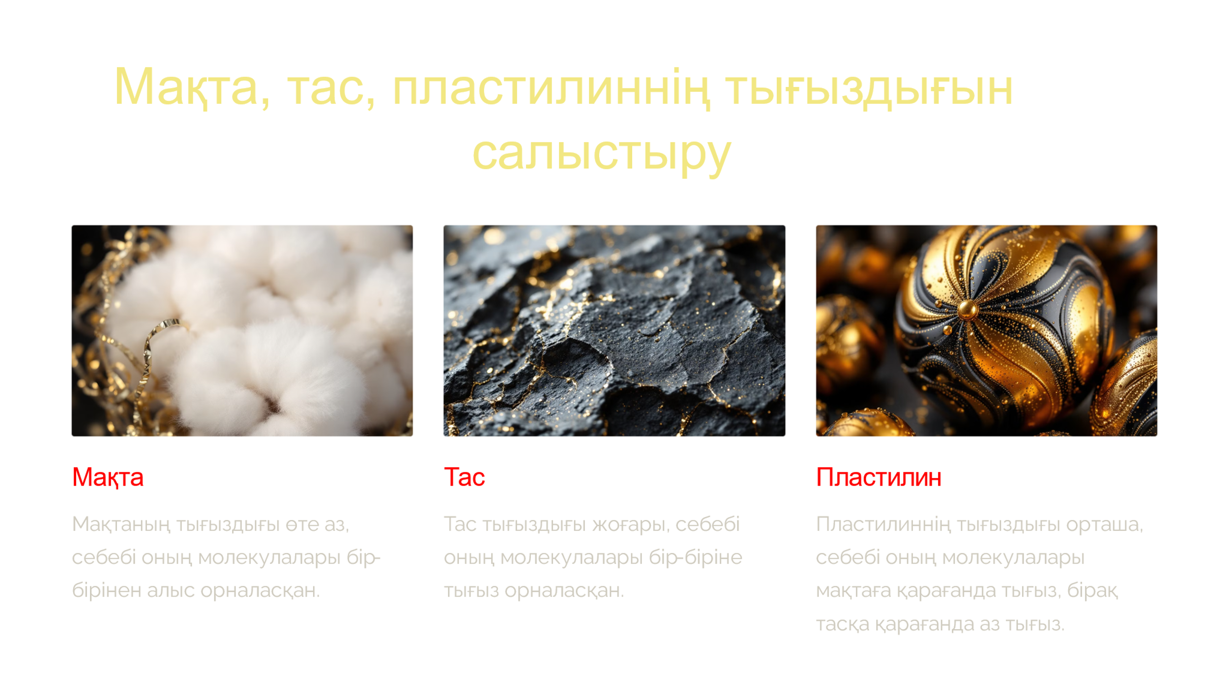 тығыздық анықтамасын, оны анықтау жолдарын, өлшем бірлігін білу – әрқайсысына 1 балл. (жалпы 3 балл)