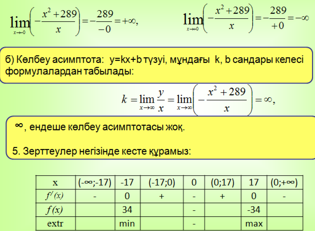 4. Функцияның асимптоталарын табамыз.а) Вертикаль асимптота: х=0 түзуі (Оу өсі), себебі: |
