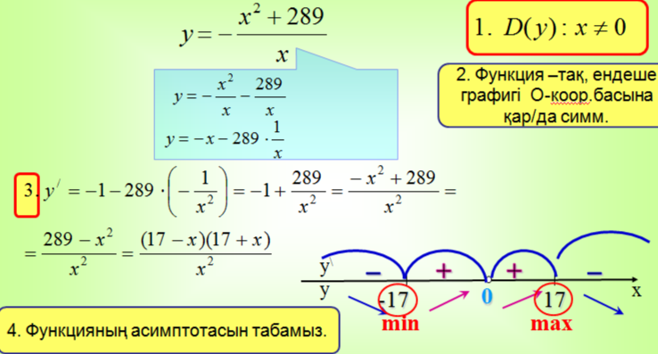 Дескриптор: -бірінші ретті туындысын табады; -сындық нүктелерін табады; -таңба аралығын анықтайды; -ең үлкен және ең кіші аралығын анықтайды; |