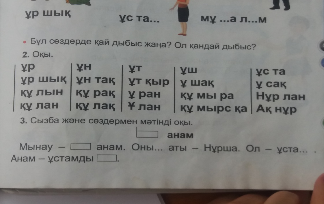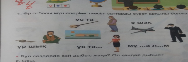 Барлық оқушы: Ұ дыбысын таниды, ажыратады және оны дыбыспен сәйкестендіреді. Жазу жолын, жоларалық кеңістікті, жолдың жоғарғы және төменгі сызығын сақтап, әріп элементтерін каллиграфиялық талаптарға сай жазады. Сөз/сөйлем сызбасын оқу. Оқушылардың көпшілігі: Мәтіннің мазмұнын тақырыбы немесе оның суреті бойынша болжайды. Кейбір оқушылар : Сурет бойынша сұрақ қояды және берілген сұраққа дұрыс жауап береді. Тақырыпқа байланысты тірек сөздерді қолданып жай сөйлемдер құрастырады және жазады. |
