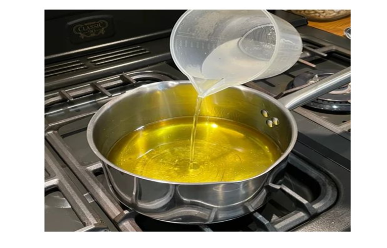 Сабын жасау процесінің бұл кезеңінде өсімдік майлары қолданылады. Майлар — сабынның негізгі шикізаты болып табылады. Олар сабынның құрылымын, жұмсақтығын және теріге әсерін анықтайды- 250 мл өсімдік майы (күнбағыс, кокос, пальма немесе зәйтүн майы) алдын ала өлшеніп, ыдысқа құямыз.