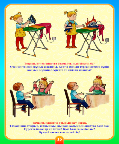 Балалар: - қайшы, пышақ, ине, таблеткалар, кір жуғыш ұнтақ, үтік, шәйнек, пеш, сіріңке.