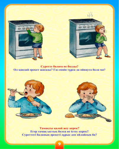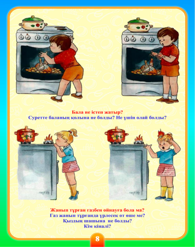 Тәрбиеші: Иә, дұрыс. Күйік деген не? Бұл ыстық заттардың, ашық оттың немесе будың әсерінен терінің зақымдануы. Үйде немесе балабақшада күйікке не себеп болуы мүмкін?