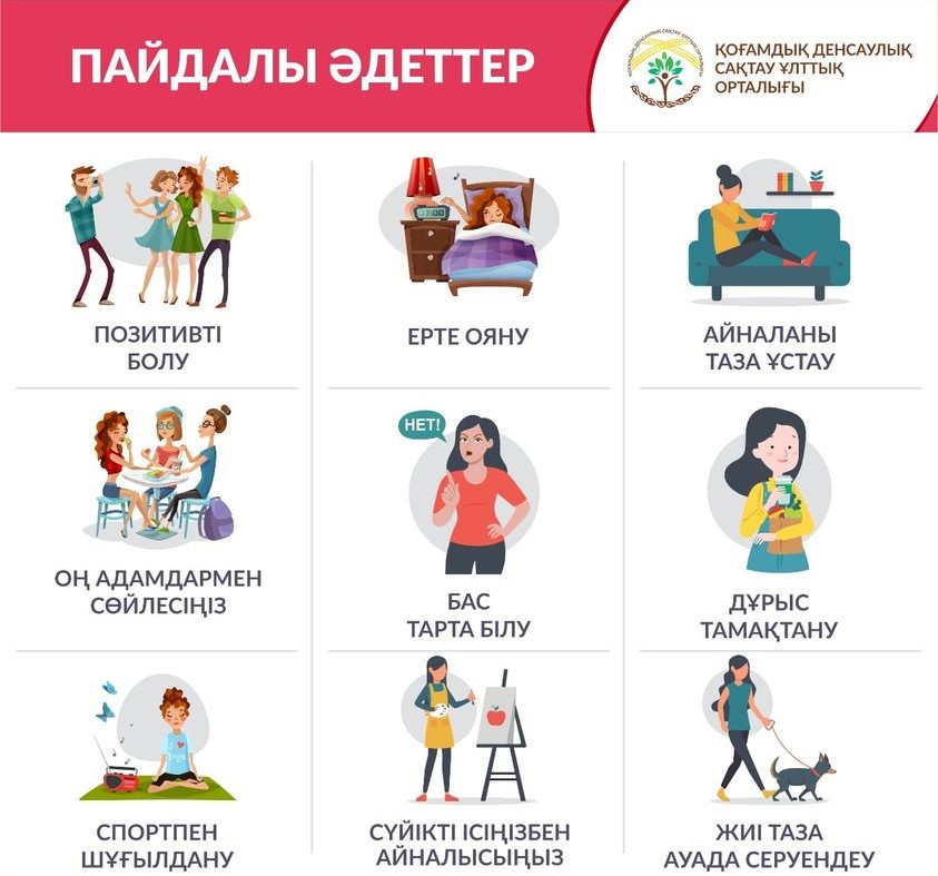 9.4.1.3.адамның пайдалы әдеттері: шынығу, дұрыс тамақтану, спортпен шұғылдануын атау және құрметтеу; зиянды әдеттер: артық тамақтану, гиподинамия, араққұмарлық, шылым тарту, нашақорлық пен таксикоманияны атау және талқылау; |