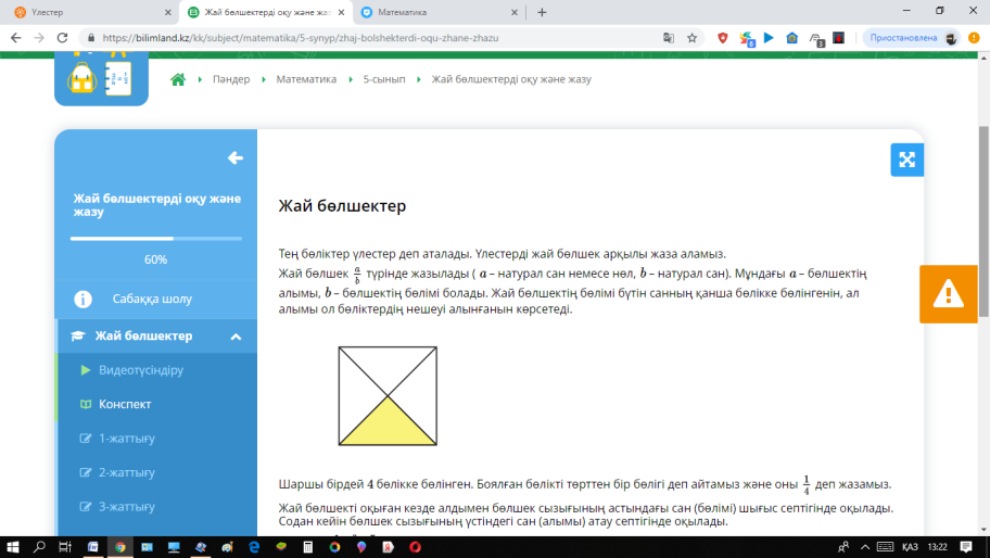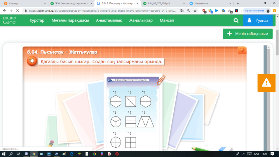 Дәптерге жай бөлшектің ережесін қысқаша жазып алады. Жеке тапсырма Жұмыс парағы таратылады. Оқушы берілген бөлшек бойынша фигураның тиісті бөлігін бояйды.