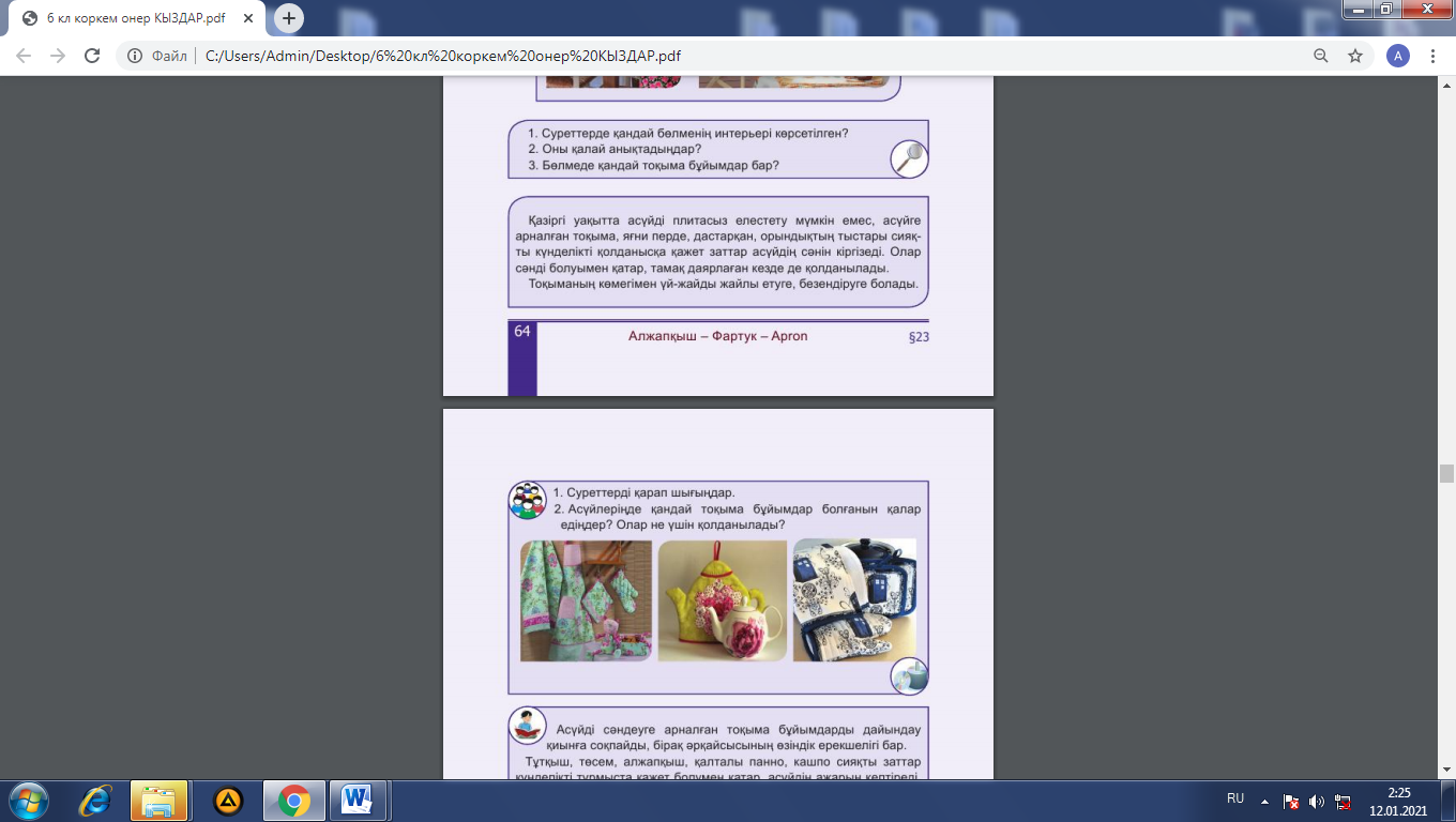 Жаңа сабаққа байланысты бейнеролик және слайд көрсетіледі. Асқаналық бұйымдар алжапқыш, тұтқыштар туралы түсінік беру, олардың түрлері, жасалу жолдары, қажетті мата түрлері, түстер үйлесімділігі, нобай, идея құру үлгілерін слайд, арқылы таныстырады. Жұмыс барысында мұғалім жеке бастың гигиенасына, қауіпсіздік ережелеріне, материалдар мен құрал жабдықтарды пайдалану ережелерін сақтауды естеріне салып, ескертеді №1.Ойланайық, пікірлесейік! 1.Суретті қарап шығыңдар. 2.Асүйлеріңде қандай тоқыма бұйымдары болғанын қалар едіңдер. 3.Олар не үшін қолданылады? 4.Өз ойларыңды сыныптастарыңмен бөлісіңдер