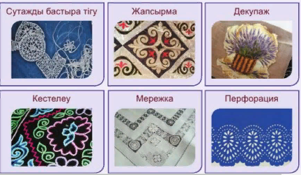 Көрсетілген тоқыма бұйымдарын сипаттама береді Асүйлеріңде қандай тоқыма бұйымдар бар, олардың дизайны туралы ойларын айтады Берілген тапсырма бойынша сәйкестеніру жұмысын жасайды Дескриптор: -суреттерді аталуымен сәйкесстендіреді -тоқыма бұйымдарын сәндеу тәсілдерін ажыратады. Дескриптор: -берілген қиындыларды пайдаланып, оюды құрастырады -ою-өрнектердің түрлерін біледі Пазл құрастыру арқылы берілген қағаз қиындыларынан ою-өрнектердің үлгісін шығарады