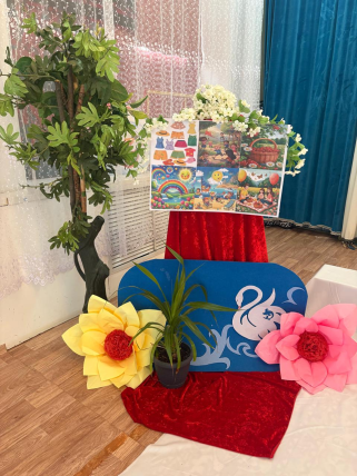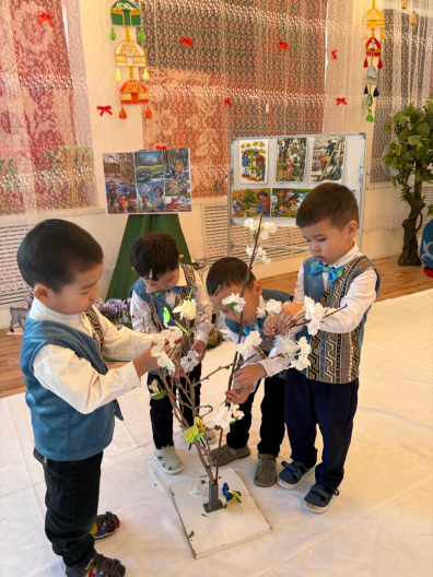 Мақсаты: Балаларды шығармашылықпен айналысуға және табиғатқа қызығушылығын арттыруға үйрету, макеттегі бүршік жарған ағашқа гүлдер жапсыру арқылы гүлдердің құрылысын және өсудің алғашқы кезеңдерін көрсету.