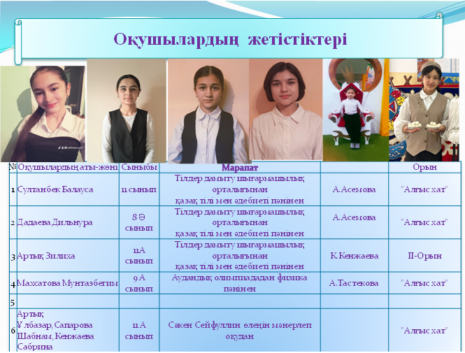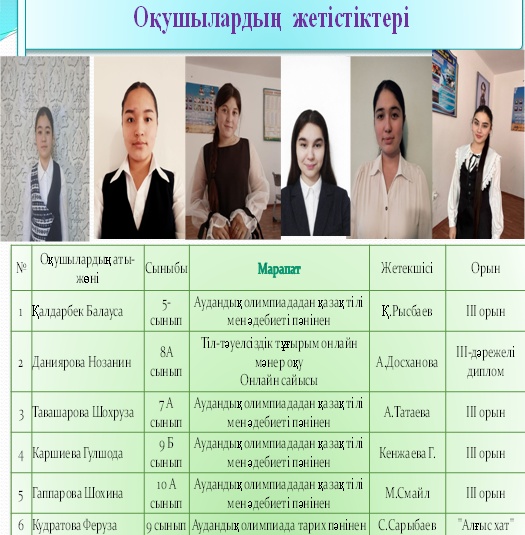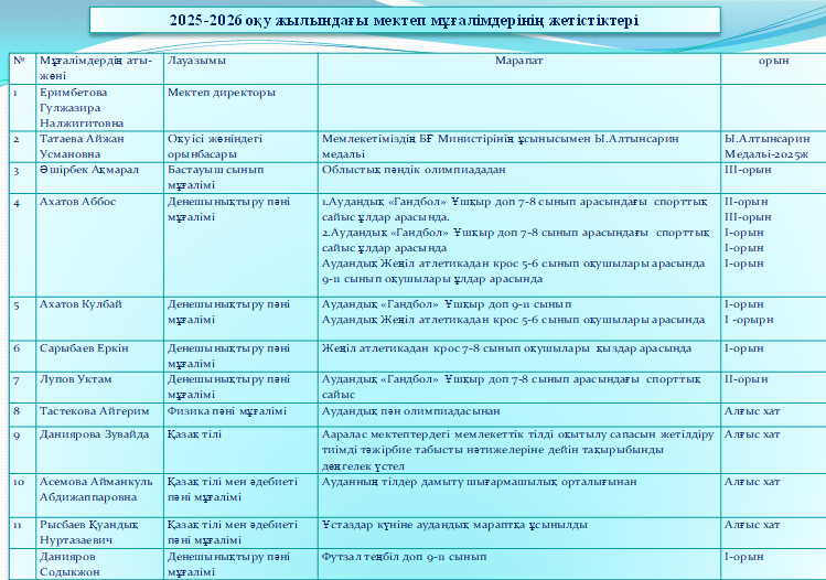 Мектебімізде білім сапасын арттыру, оқушылардың шығармашылық және зияткерлік әлеуетін дамыту, құқықтық тәрбие беру, кәсіби бағдарлау бағытында жүйелі жұмыстар жүргізілуде. Түрлі деңгейдегі байқаулар мен олимпиадалардағы жетістіктер, тәрбиелік маңызы зор іс-шаралар, құқық қорғау органдарымен бірлескен кездесулер – соның айқын дәлелі.