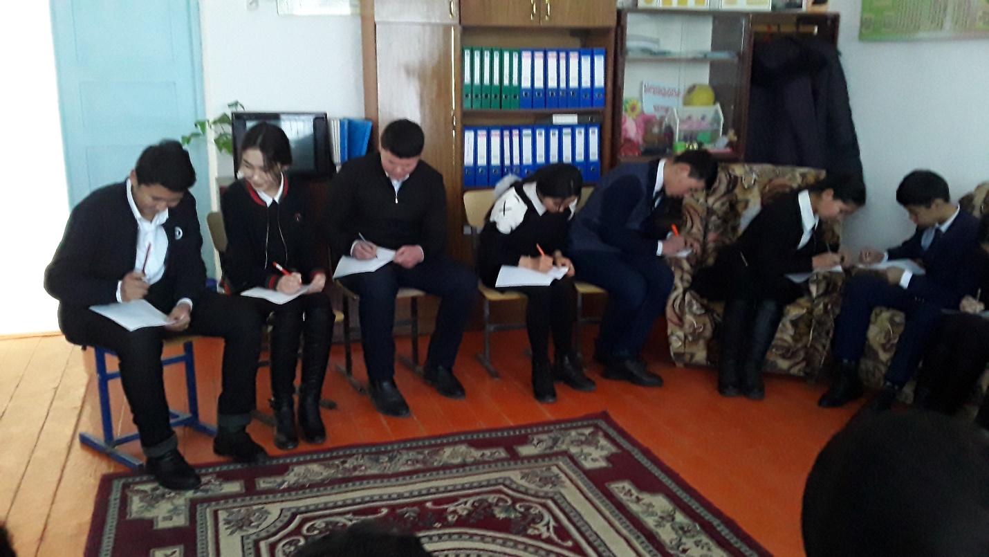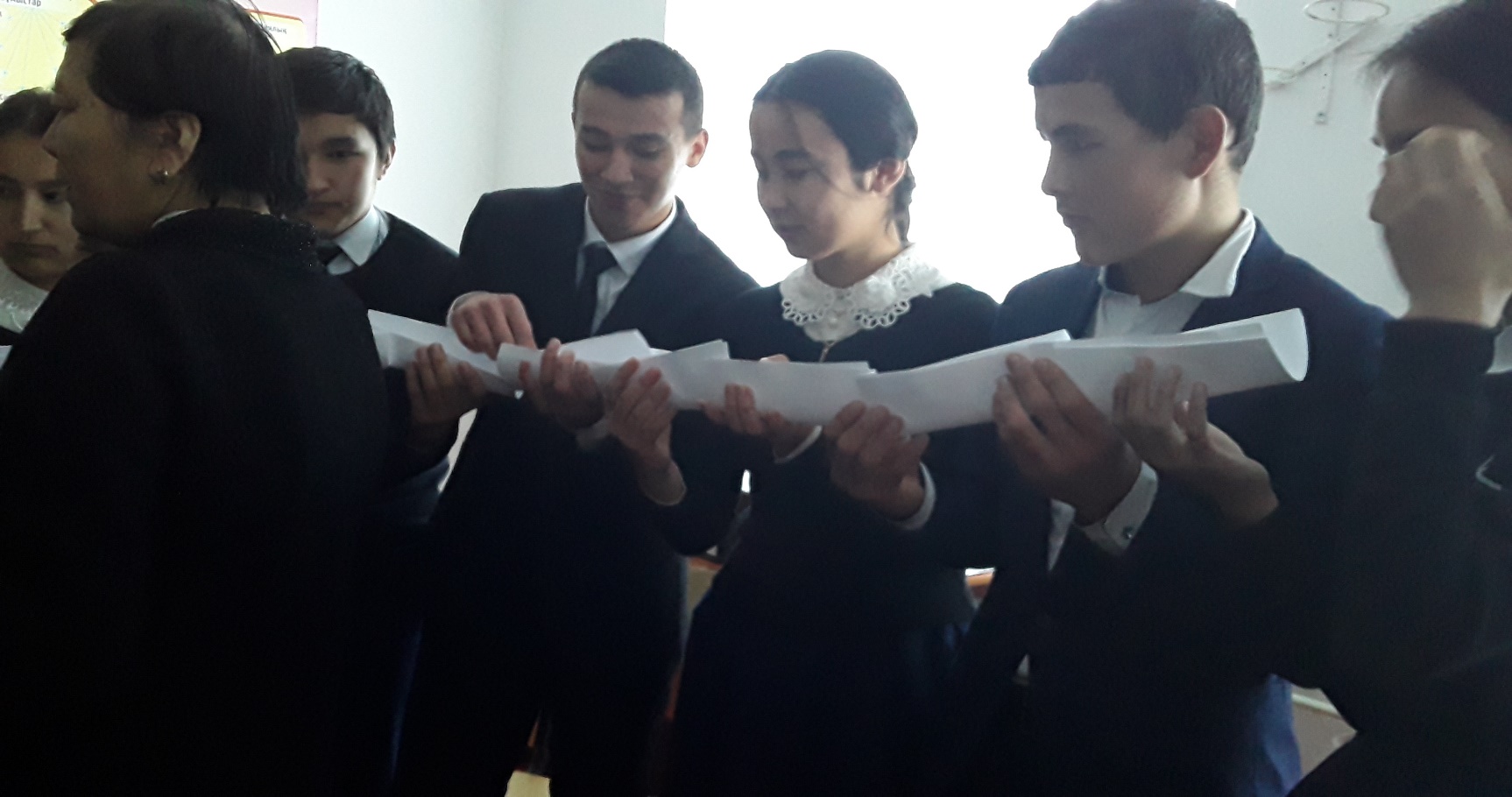 Психолог: Құрметті мектеп түлектері алдарыңда үлкен сын, намысты дода, сол сынға әрқашан сеніммен барыңдар. Бақытты ғұмыр болмайды, ол бақытты секунд, бақытты минут, бақытты сәттерден тұрады. Біз сол бақытты сәттерді сезіну арқылы бақытты боламыз. Бір-біріңнің қолдарыңды ұстап жоғары көтеріңдер, біркелкі хор дауыспен «Біз ҰБТ-ға сеніммен барамыз!», - деп айқайлаңдар.
