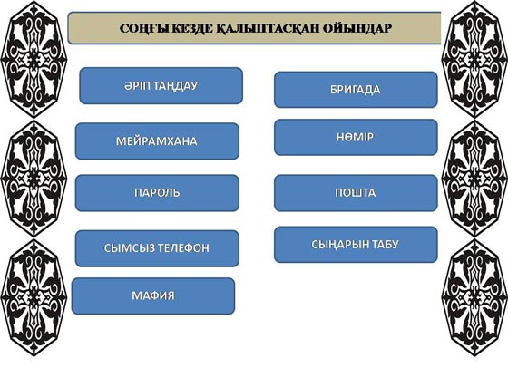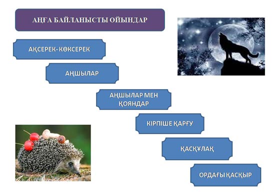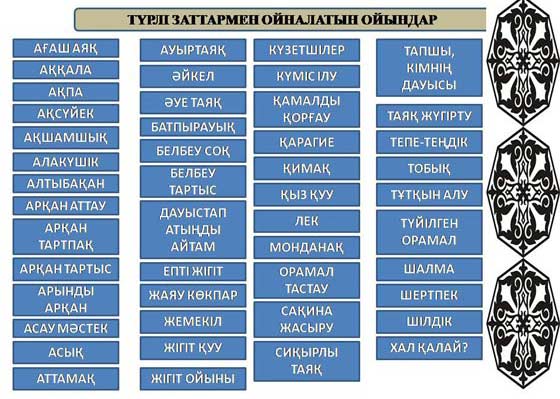 Ойын шарты: Үш топтың ойыншылары ат пен шауып барып тапсырма орындайды.Тапсырма үш топқа үш түрлі,бірінші топ аңға байланысты және ептілікті,икемділікті қажет ететін ойындарды жазса, екінші топ тоғызқұмалақ отауларының аттарын жазса,үшінші топ малға байланысты және түрлі заттармен ойналатын ұлттық ойындарды әр ойыншы бір-бірден тізіп жазуы керек
