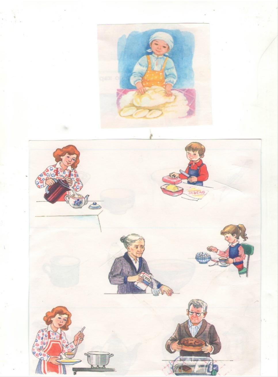 Тәрбиеші. «Бізде осылай, ал сендерде ше?» деген көңілді ойын ойнаймыз. Әр біреуің кешкі мезгілде үйде не істейтіндерің жайында айтып бересіңдер. Мен бастаймын: «Кешке жұмыстан кейін барлығы үйде жиналып, жұмыс істейміз. Мен анамын аспазшы, ақ орамал мен алжапқышымды тағамын;