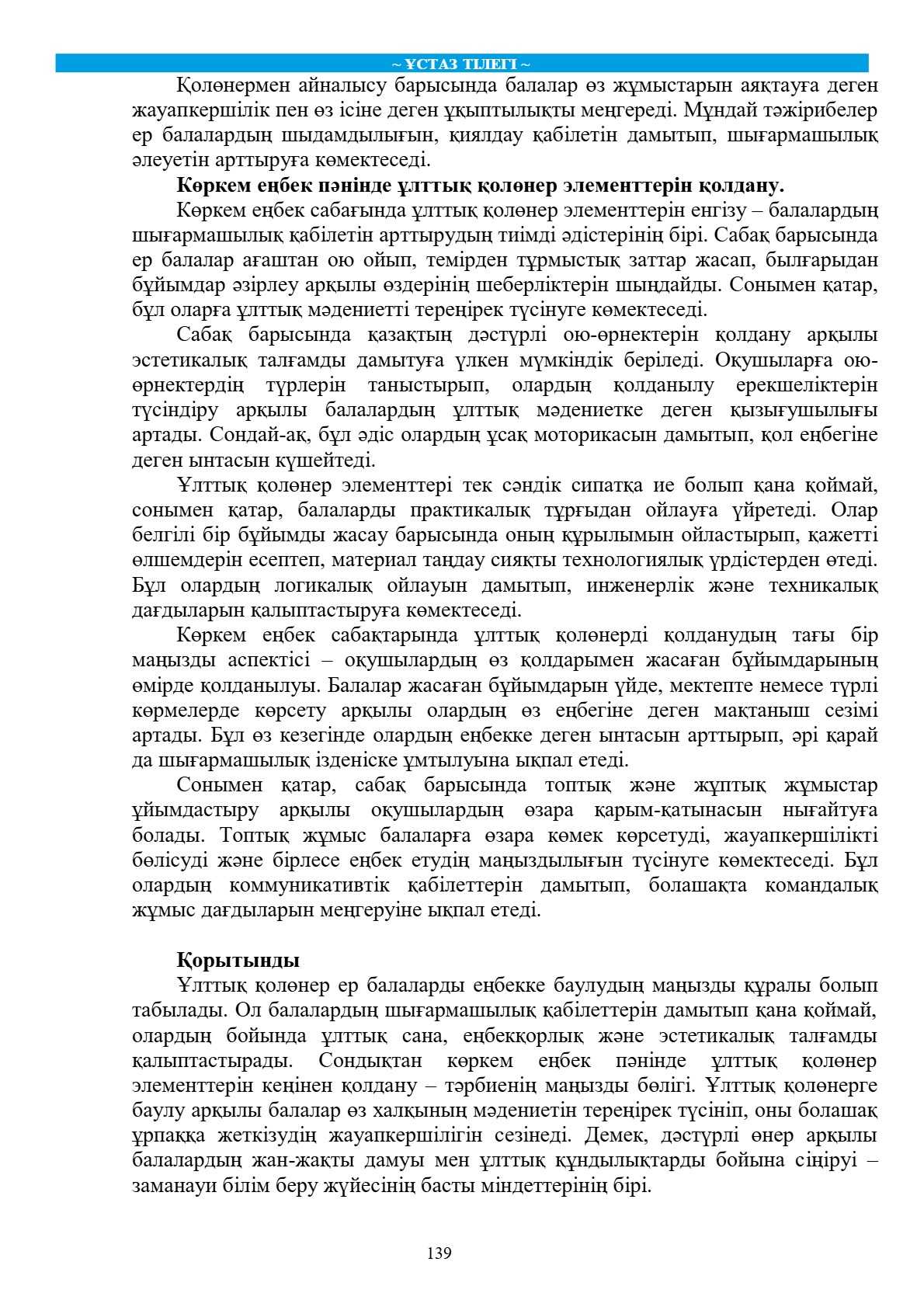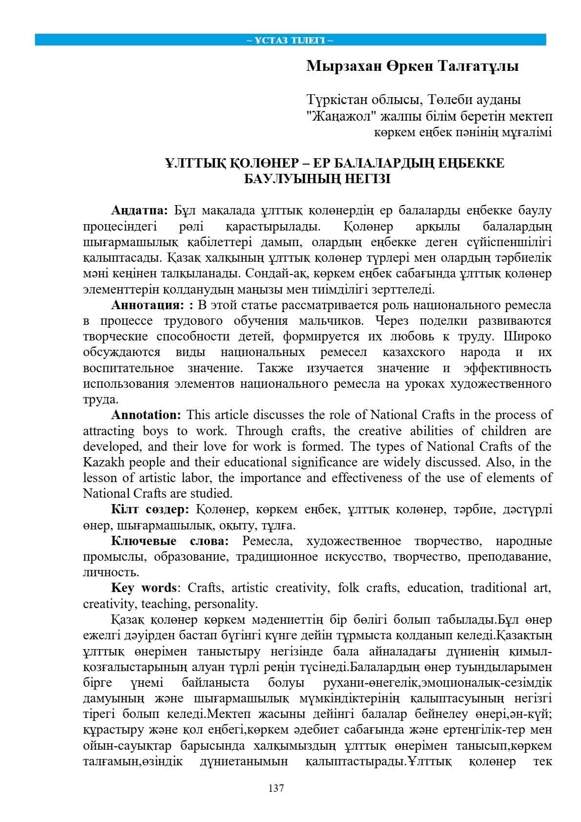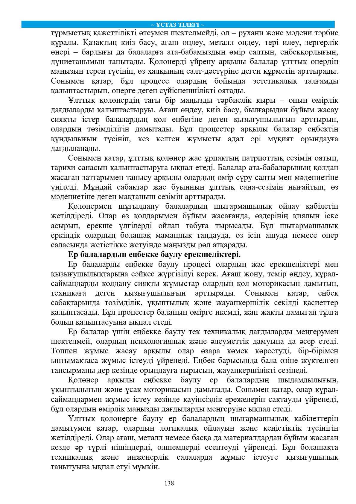 Бұл мақалада ұлттық қолөнердің ер балаларды еңбекке баулу процесіндегі рөлі қарастырылады. Қолөнер аркылы балалардын шығармашылық қабілеттері дамып, олардың еңбекке деген сүйіспеншілігі қалыптасады. Қазақ халқының ұлттық қолөнер түрлері мен олардың тәрбиелік мәні кеңінен талқыланады. Сондай-ақ, көркем еңбек сабағында ұлттық қолөнер элементтерін қолданудың маңызы мен тиімділігі зерттеледі.