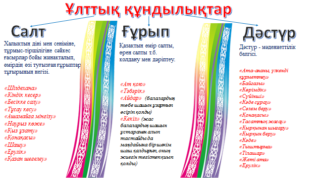 Дәстүр-халықтың атадан балаға көшіп,жалғасын және дамып отыратын тарихи әлеуметтік, мәдени-тұрмыстық, кәсіптік, салт-сана, әдет-ғұрып,мінез-құлық,тәлім-тәрбие және рухани іс-әрекеттер көрінісі. Қазақтың бірнеше дәстүрлерін атап өтсек. Ғұрып— қазақтың өмір салты, өрен салты қолдану мен дәріптеуді ғұрып дейміз. Қазақ халқында қалыптасқан бірнеше ғұрыптар: |