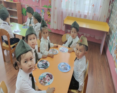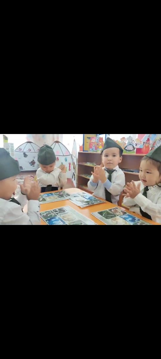 -Күндіз күлкі, түнде ұйқымыз тыныш болсын деген тілекпен, бүгінгі «9 мамыр – Жеңіс күні » атты ашық ұйымдастырылған оқу іс-әрекетіміз, бізге балалық шақ, бейбіт өмір әперген Ұлы Жеңіске арналады. Жыл сайын 9 мамыр күні адамдар ескерткіштерге барады. Олар жауынгерлердің тас мүсініне айналған бейнелеріне гүлшоғын қойып, батырлар есімін еске алады.