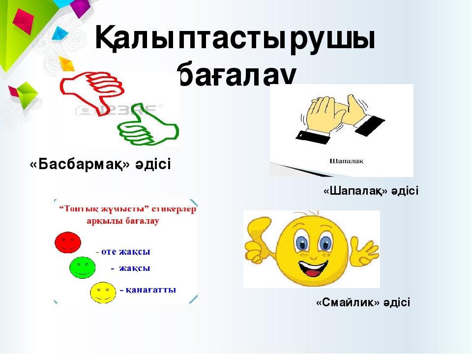 «Шапалақ » әдісі арқылы бағалауы Мұнда оқушылар қарсы топтың тапсырмасы дұрыс болса, қол шапалақтайды. |
